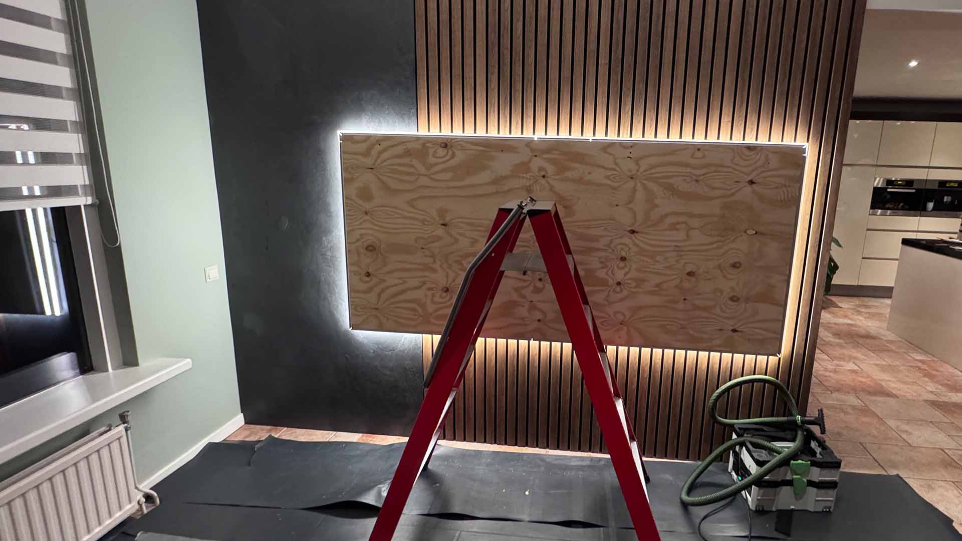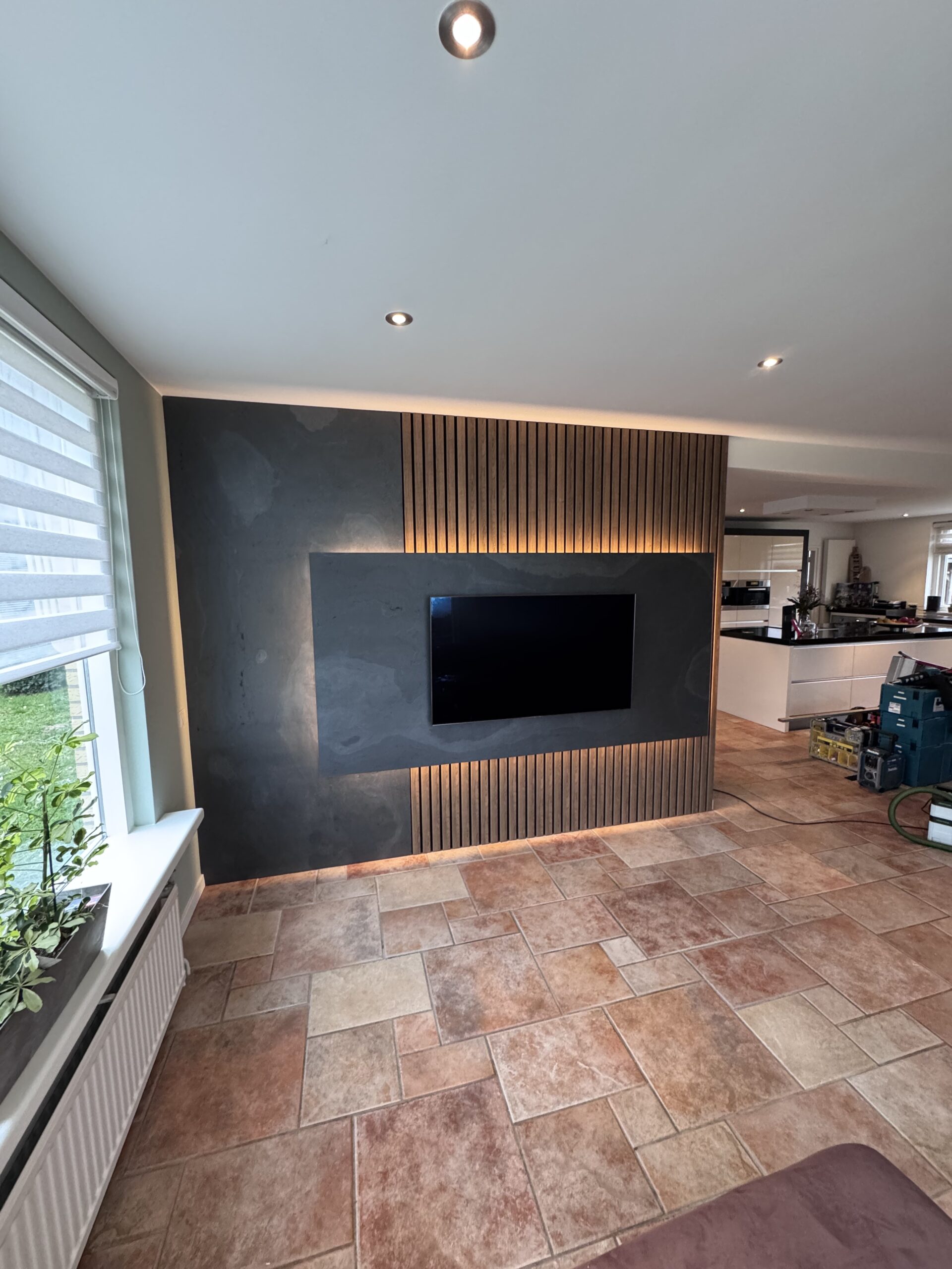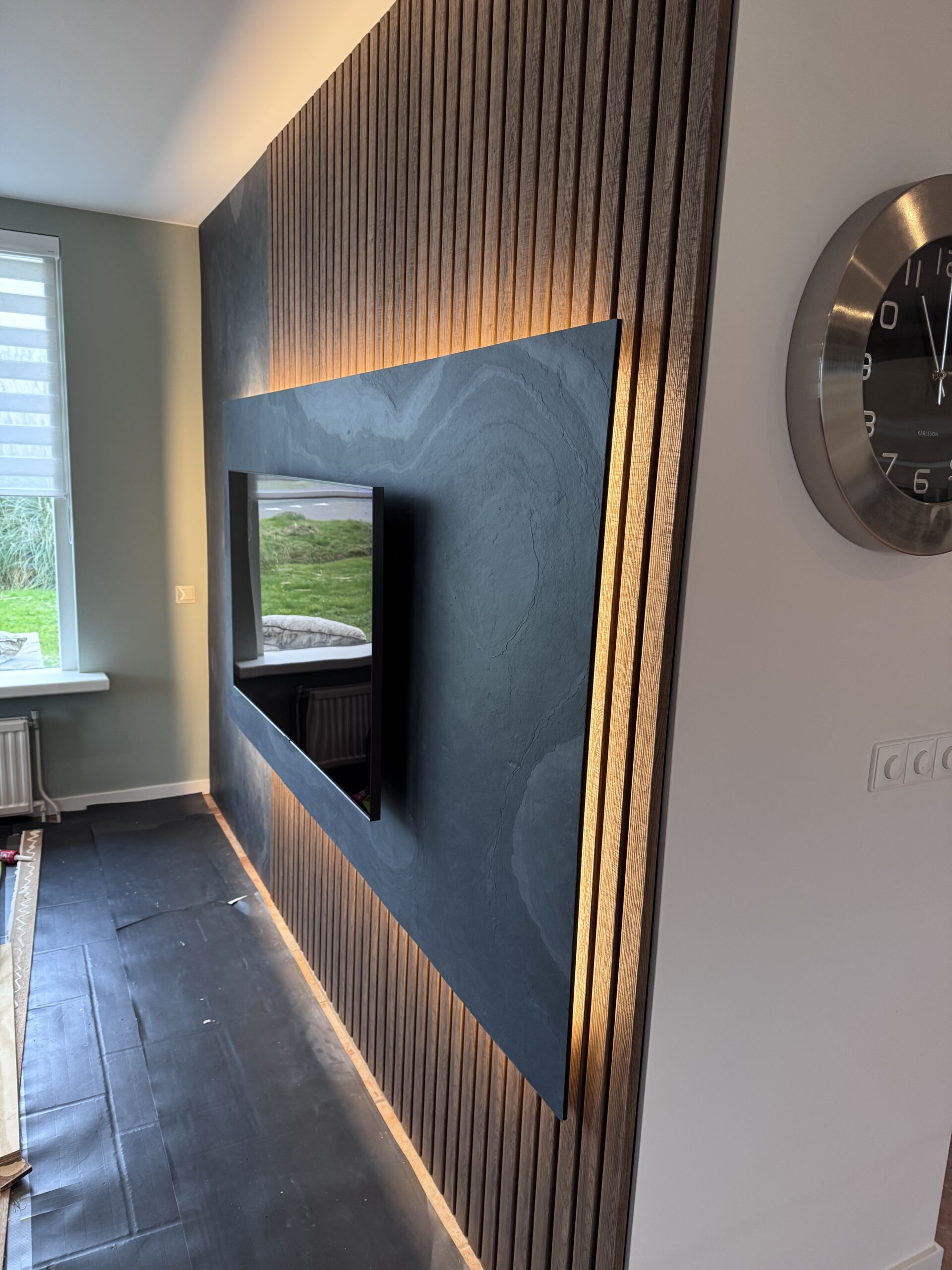 Dit project betreft de realisatie van een moderne cinewall, waar de stijlvolle combinatie van natuursteen, LED-strips en akoestische panelen in walnoot houtkleur centraal staat. Met zijn indrukwekkende natuurstenen afwerking creëert deze wand een robuuste en luxe uitstraling, terwijl de warme walnootkleurige panelen visueel aantrekkelijk zijn én bijdragen aan de akoestiek van de ruimte. De ingebouwde LED-strips zorgen voor sfeervolle verlichting die de textuur van het natuursteen en de houtkleurige panelen subtiel accentueert. Het resultaat is een perfecte balans tussen functionaliteit, esthetiek en comfort, ideaal voor een moderne woon- of filmruimte.
